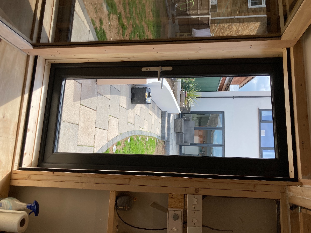 Finally, I took the door back on to the floor, stuck glazing tape to it and then my partner and I carefully dropped the glass into the door. We had to lift it back up to get it square which was a right pain due to the glazing tape, but hopefully we got away with it. I then silicon sealed the gaps between the glass and the wood, and left it to dry.