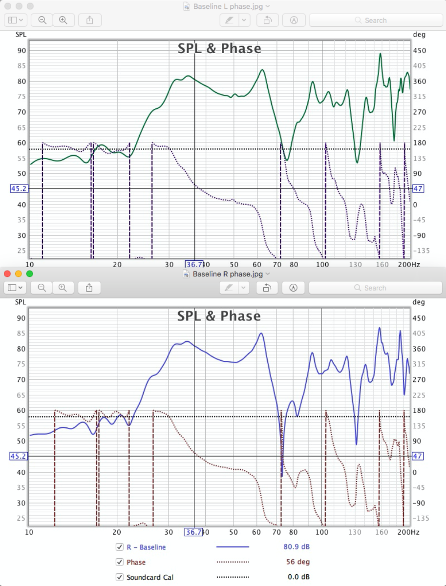 There is a phase difference between the two speaker's responses, which I'm guessing means they aren't perfectly symmetrical. Can anyone clarify if I'm right about that? I'll check positioning before committing to their position when I build the soffits, starting on Monday!