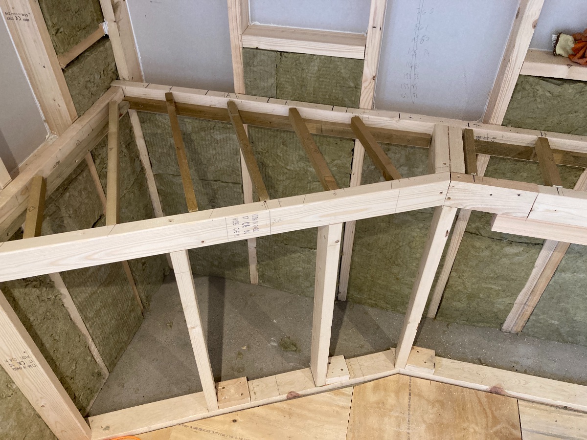 I have managed to make the hangers for under the left side soffit shelf and put some of the framing in for the shelf above the soffit front. I also filled the stud bays under the soffit shelf with Rockwool RWA45 and cable clipped power and xlr cables for the monitors to the framing.