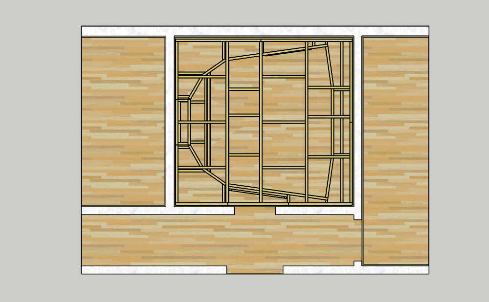 ! The front baffle will be bigger again, and the Lr and Rr won’t even have a baffle, just false walls around them, so the reflective surface is only the speaker itself. The baffle around the L, C and R speakers are enlarged again to the whole front, but there is space underneath and above for the Hangers to work properly and for the speaker ventilation. Underneath I have a 32cm slot, and above a 42cm slot. Also, with the new framework introduced in my last post, there is a false wall for the bass hanger. I hope this will be okay and the bass hangers will work. Here, I would like to have some feedback.