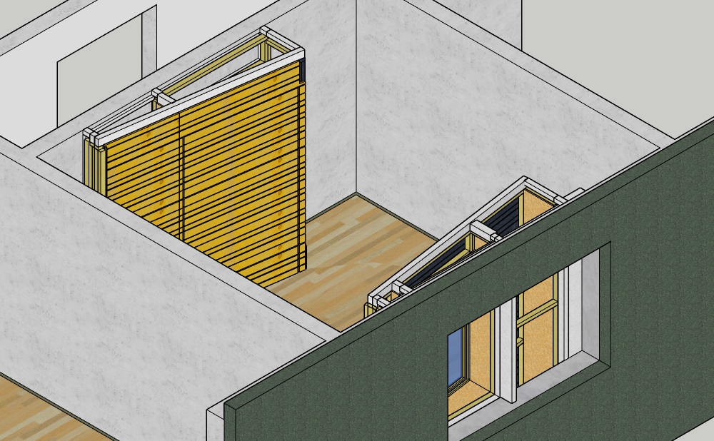 On the other side of the room, there is the window. As stated in the chapter "the room", only one of the two frames of the window is intended to be open, the other one is just window glass in a frame. My Idea is to cover the non-open able window and only use the window, which I'm able to open to let the light and fresh air in. The other window will be covered by a slat resonator, which also uses the volume of the window sill. To prevent a vented connection between the slat resonators behind the reflection free zone baffle and the volume for the open-able window, both sides will be sealed with memory foam again.