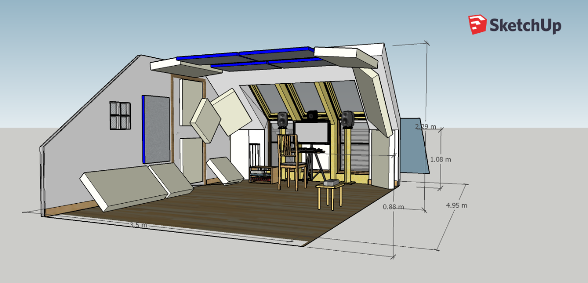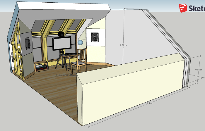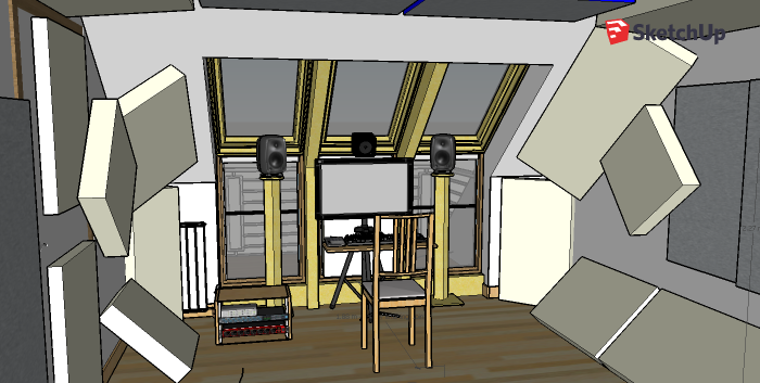The studio is on the second floor of our detached house. We moved here in 2015. It's a modern timber frame construction with a pleasing block cladding, built by the previous owner (a professional builder) for his family. The studio is in the "attic" and the walls are part sloping along one dimension. I quoted attic because it isn't really - the house was designed and built this way, so has proper sized stairs, landings, doors and so on. Even before treatment the studio room had appealing acoustics.