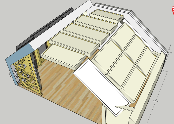 Here's an interesting observation though: every room in the house is really comfortable even in the hottest days of summer, apart from the studio. I measured the temperature on a hot day here: 20 degrees centigrade outside, 30 inside the studio. The hottest it gets here outside is about 27 degrees, and that for probably only a day or two each year. The heat buildup in room 1 is due to the greenhouse effect of all these South facing windows. If I open some windows for long enough, the room gets close to ambient outside temperature, and all is well heatwise, if not acoustically