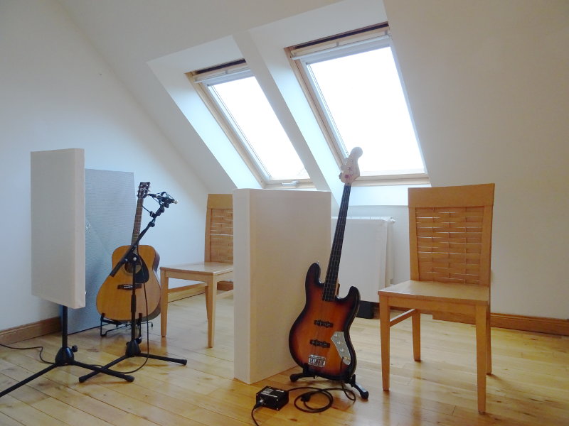Not long after completion though, a jazz composer I had played bass for asked if he could record his band here. Drums, sax, guitar and bass, all to be recorded live. I figured we could do it all in room 1, gave our neighbours advance warning of potential noise and promised them it would end 5pm at the latest. I spoke to them the day after, and happily they didn't hear a thing. In our garden you could hear there was a band playing, but it wasn't bad at all.