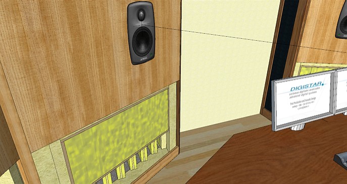Right. Make that absorption thick, and light. Or maybe layered, with lower density insulation in front, and heavier stuff behind.absorption will be required on the side wall at the reflection point. Splayed walls at this point is not really an option because of the room door;