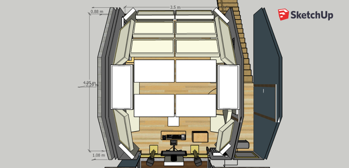 I haven't checked that in your SketchUp model, but Ill try to find time to do that.It seems logical that the monitors should be the same distance from the front of the room, so the distance from acoustic axis to baffle edge closest to centre of the room is kept constant. The most optimum I could come up with was the following;