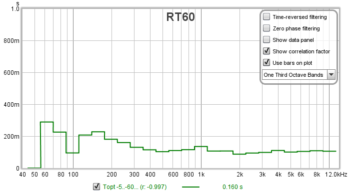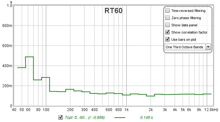 Right. It's a little too dry for a control room, and since you also want to track a variety of instruments in there, adding a bit of life would be a good idea. Some musicians find it hard to play well in a dry room: they like to hear a bit of room reverberance, to play better.2) RT60 decays too quickly in highs. Room volume is 31 cubic metres (1094 cubic feet), so according to ITU BS.1116-3 specs for control rooms the reverberation time should be 0.17s. For live room use, I'm a huge fan of dry warm 70's type recordings, and love to hear the real sounds of instruments. At the moment I'm totally getting this in recordings, but a little more ambience wouldn't hurt would it?Or you could make some variable-acoustic devices...I could always deploy additional absorbent gobos if I really wanted the ultra dry sound back.