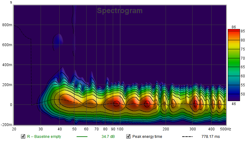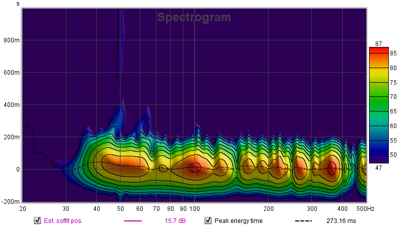 This nearfield positioning is giving an exaggerated picture of the bass decay time in the RT60 graph, maybe due to corners / internal angles in that area? The room doesn't sound at all like this when you are in it. Below I've attached some graphs from a midfield monitor position that I hope to use for soffit mounting. It is much more balanced, and coincides with what my ears and recordings tell me. Kick drums and amplified bass guitar are very tight and focused in this room.