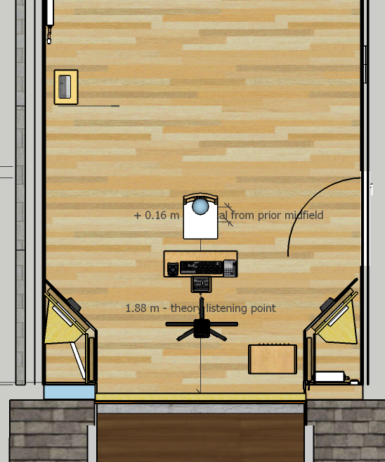 To be certain, there's a procedure I developed that I call the "walking mic" technique, and I'll post some instructions for doing that, but the basic idea is that you set up the speakers where you think they will be best, then test a whole bunch of locations with a REW test at each one, all along the room center-line, at ear-height, from the front to the back, at very small intervals (5cm between steps, in a complicated room). Then you bang your head against the wall, scream and shout, cry a bit... for a few hours as you slowly work your way through mountains of REW data, to understand not just where the best location is, but also what the individual problems are: which ones are SBIR, which ones are modal, which ones are reflections, etc. THEN you choose the best mix position location based on that, and repeat the test, but this time moving the speakers, not the mic. Slide them further apart and closer together, in small increments, to find the best location for them... then repeat the mic test one more time. That's a "relatively" fast method for finding the best layout.I've already determined the mix position to be a good one - it was where I was in a previous midfield monitor arrangement. It's 2.04m from the front, a bit further than theoretical 38% but it was really good there.
