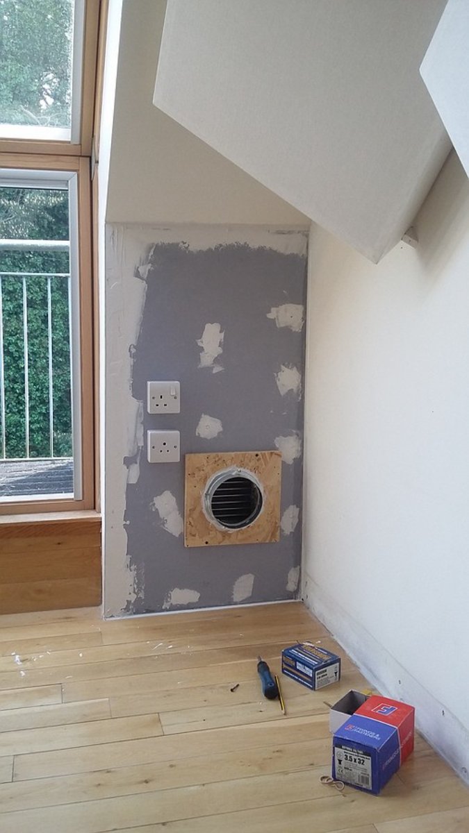 The silencer is screwed into a noggin under the outlet to support it. A temporary OSB support is at the top to hold the position while this is being done.