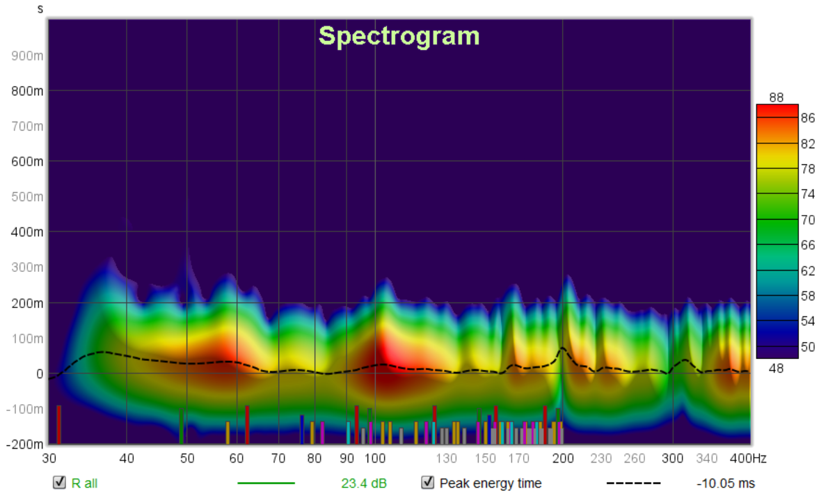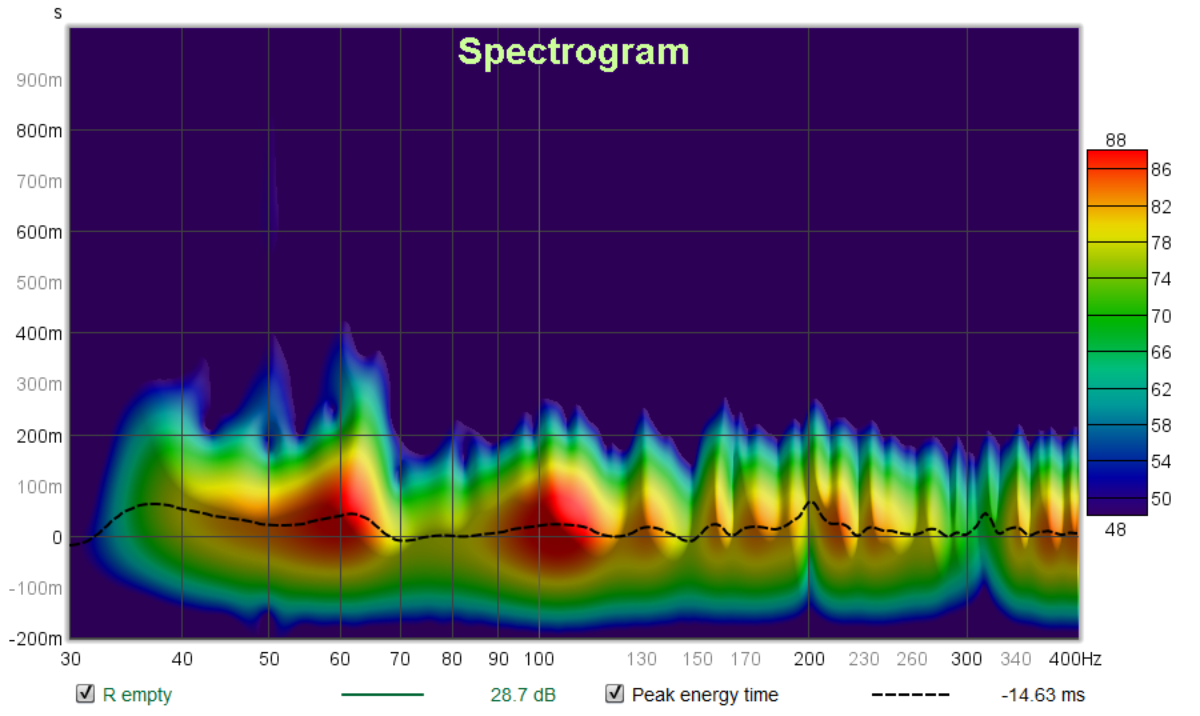 The main goal of this superdooperchunk at the rear of the room is to reduce the room mode resonances. How well does it perform? Spectrograms for left speaker without and with the superdooperchunk;