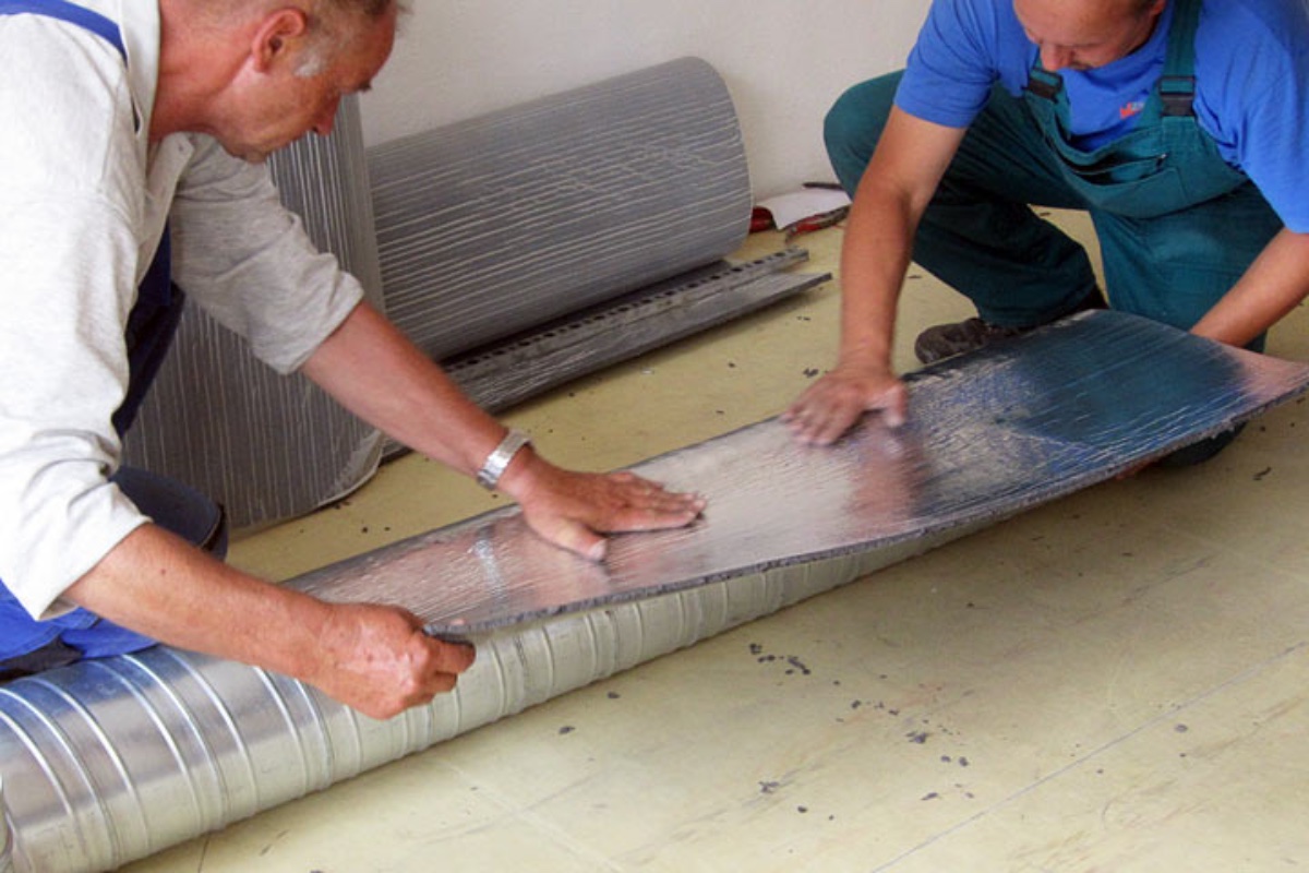 A little history may help. In 2015 my wife and I bought the HVAC used in this new studio. In preparing it for the room it would be in back then the HVAC guys wrapped it, saying the foam dampens the duct from ringing with any sound inside the duct. Here are two of the guys wrapping the self-adhesive duct wrap around a duct.
