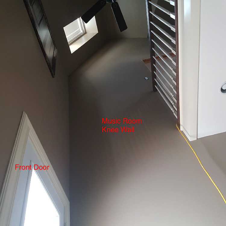 I have small music room on the second floor of an attached garage with a cathedral ceiling. It is adjacent to the master bedroom and adjacent to a partially finished workshop at the rear. The music room faces a busy street 39' in front, and faces two large apartment complexes 108' in front, across the street. The house is under a flight path, and has a railroad track approx. 600' behind the back yard. The approximate Dimensions: of the room are: Floor area 270.5"x182.5", knee wall height is 31.5", and the subfloor to bottom of central support beam 117.5"