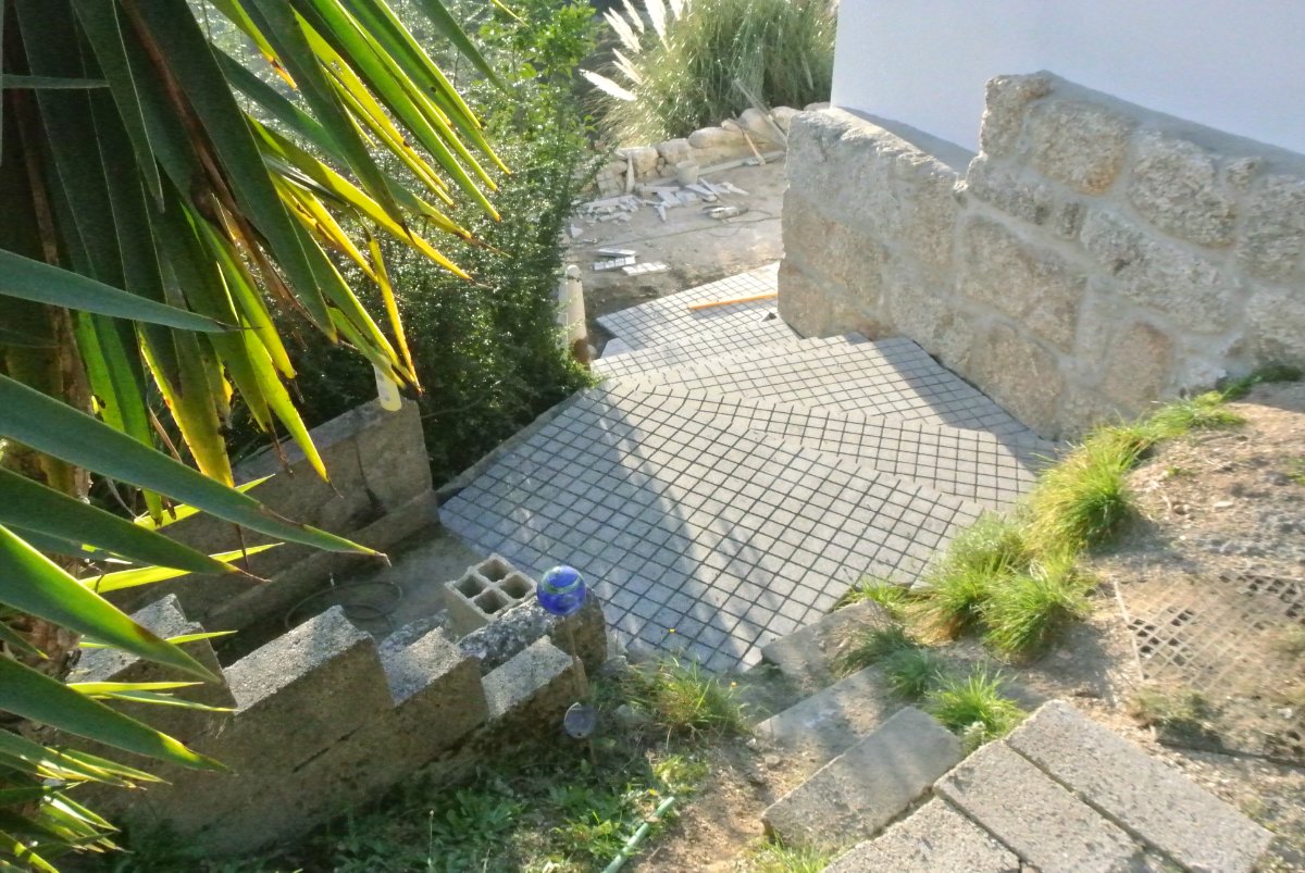 Joules has pulled the cables (data and electricity) over to the house now and will connect them. We have also made the steps and had the tiles laid in the front of the studio and it looks really nice... Still a bit to do around the edges.. Slow progress..