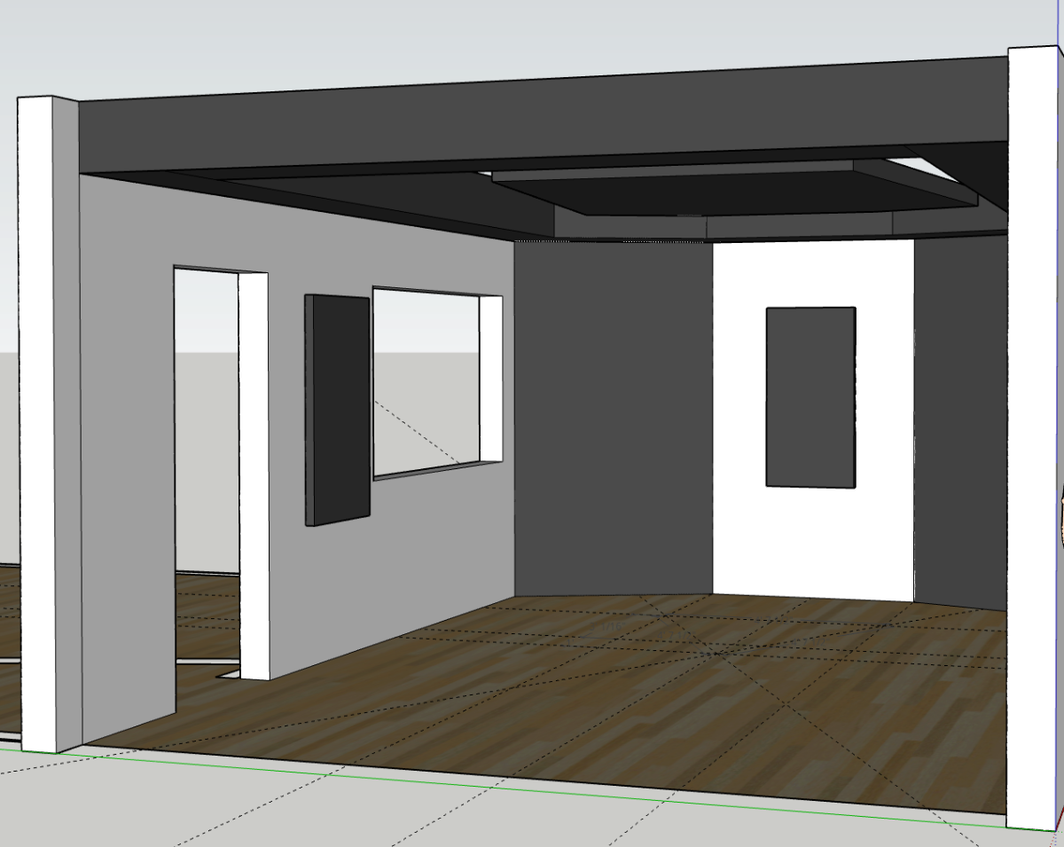 Likewise in the horizontal direction: the general rule is that the soffit baffle should be at least three times the diameter of your low-frequency driver. So if you have a speaker with an 8" woofer, then you want the soffit baffle to be at least 24" (60cm) wide. Wider is better. An even more solid "rule of thumb" is simply that the baffle should be at least a 1/4 wavelength of the lowest frequency that the speaker will produce. That's hard to do in the majority of rooms! But it's a good goal to keep in mind, and will put at the forefront the basic need to make it as wide as you possibly can.Clouds are good. Deep clouds are better. Angled clouds are better still (higher above your head, lower towards the speakers), and hard-backed clouds are even better yet! Shape isn't that important, so you can shape it any way you think looks good, but do make sure that it completely covers the first reflection points up there, and also covers the areas that could be sending too many unwanted reflections towards the back wall, side walls, or rear floor. This might help: [url=https://digistar.cl/Forum/viewtopic.php?f=9&t=2&p=2Raytracing assistant for Sketchup, for visualizing speaker dispersion[/url]The ceiling cloud is about 8'x10' trapezoidal and will be 4" deep and 3" off the ceiling to account for LED lighting that I will be putting on top.Are they strategically located at the first-reflection points for the mix position? Do they completely cover those points? Also, in general it's better to have treatment panels of differing depth and differing wall gaps, to avoid over-treating one specific frequency band. Many rooms end up with a "death valley" in their time-domain responses somewhere in the region of 150Hz to 500 Hz for this very reason: Overt-treatment with 4" deep traps. Make some of them 6" deep, or vary the air gap behind them, or angle them, or something! To make sure that you are not killing one part of the spectrum at the expense of another part.The 2x4 panels scattered throughout are 2" panels made with 703.Everything I've said above is pretty much the opposite of what you'd need at the back of the room for acoustic tracking! Because it is what a Control Room needs, on order to function as a Control Room.am going in the right direction and how to keep the back of the room both controlling some of the bass modes and being a "alive" for vocals or acoustic guitars....