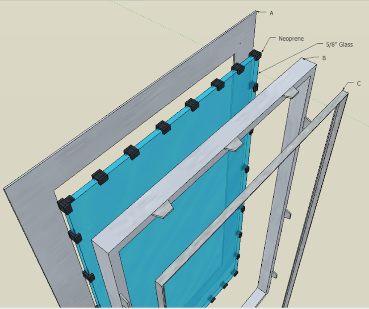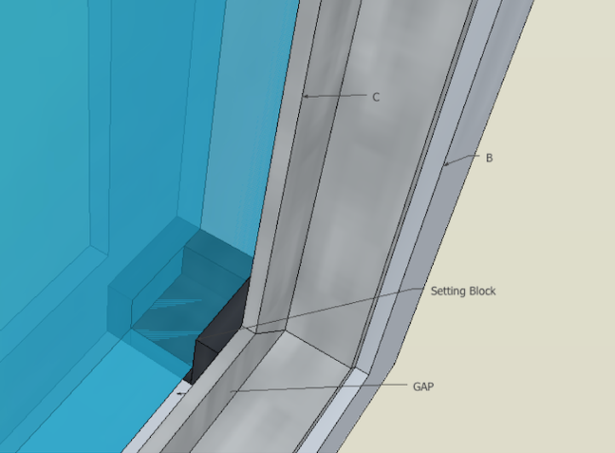 5. Would it be preferable to use glazing tape (VHB structural glazing tape) where the glass faces piece B and C, putting setting blocks only on the perimeter of the pane?