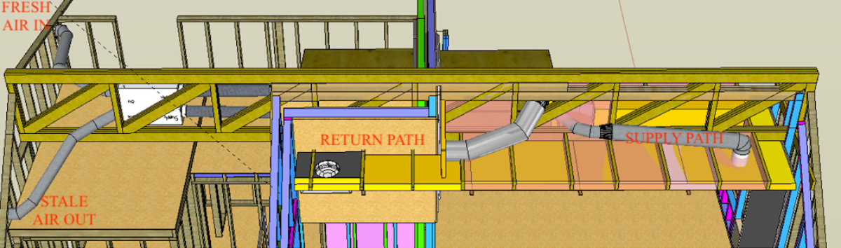 I will be making two supply paths at either side of the ridge beam to further reduce air velocity and for symmetrical finishes. As for finishes, below the collar ties, I plan on exposing the coated side of the 2" duct board. The Owens Corning duct board I will be using has similar acoustic characteristics as 2" 703. Above the duct board the space between the collar ties will be filled with pink FG batts.