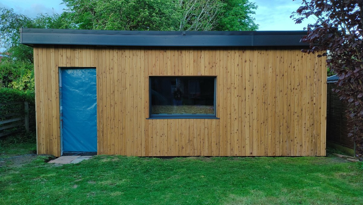 I could move to getting the Siberian Larch cladding installed and the exterior of the studio complete. Once installed I used a product suggested by the cladding supplier (https://www.silvatimber.co.uk/sansin-woodforcetm) that is supposed to protect and help weather the cladding to consistent grey; we shall see.