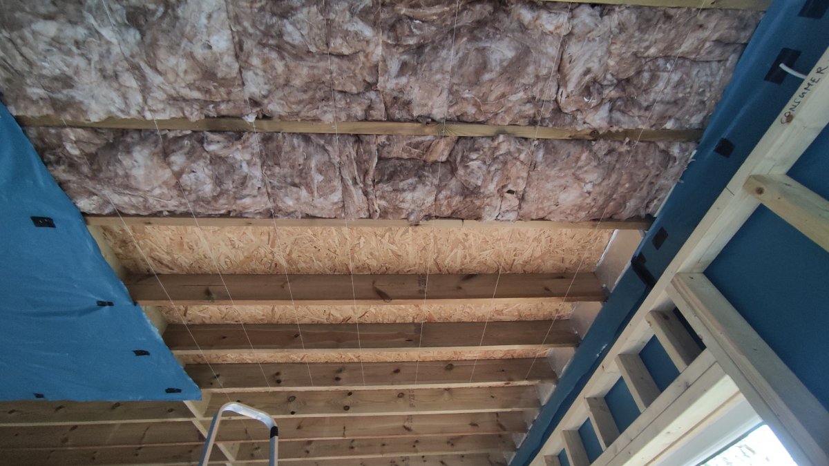 After completing/adjusting the inner leaf wall, and running some cabling for the outdoor downlight and Fan, it’s onto the outer ceiling insulation (mainly just sound reduction as the insulation is only 50mm to allow air gap above to allow air flow) and Moisture Barrier.