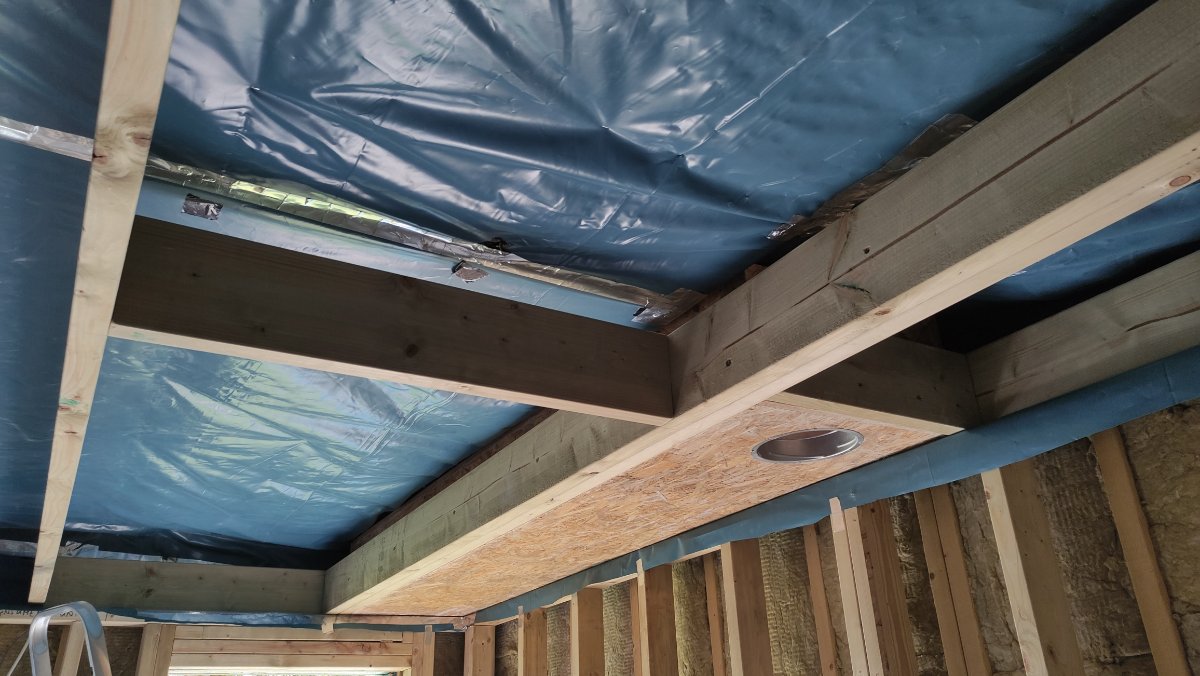 Firstly I cut the long joists and ends, and screwed them together on the ground. Then I Installed the first Joist and ends of the ceiling inner frame first and secured and sealed them onto the inner studs. This pic shows what I mean hopefully. You can also see the MB removed but the top section down around the ceiling frame and over the top of joist: