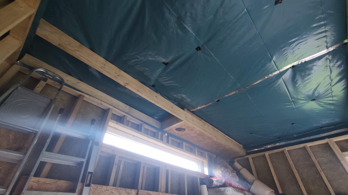 As you may notice from the previous post, the moisture barrier (MB) layer I had painstakingly installed on all walls, that would eventually join to the ceiling MB, had to be removed. As I have a good size room but limited height, I decided to go with the weird combination of normal inner walls with an inside out ceiling design (which I really liked from Gareth’s build). Which cerated a bit of confusion as to where the moisture barrier should be. Unfortunately I realised only after it was up that the moisture barrier needs to be on the ‘warm side’ of the inner leaf wall, not the outer leaf stud, which is where I had originally put it. Thankfully, I had the brainwave that I could cut the existing MB around a foot from the top, remove the rest, and then fold it over the inner stud wall, still joined to the new MB of the ceiling, ready to be joined to new sections around the walls. I think I could have left it but it may have caused damp issues in the inner lear insulation and wanted to do it properly. I realise that this probably makes no sense as text but this rough sketch shows what I mean: