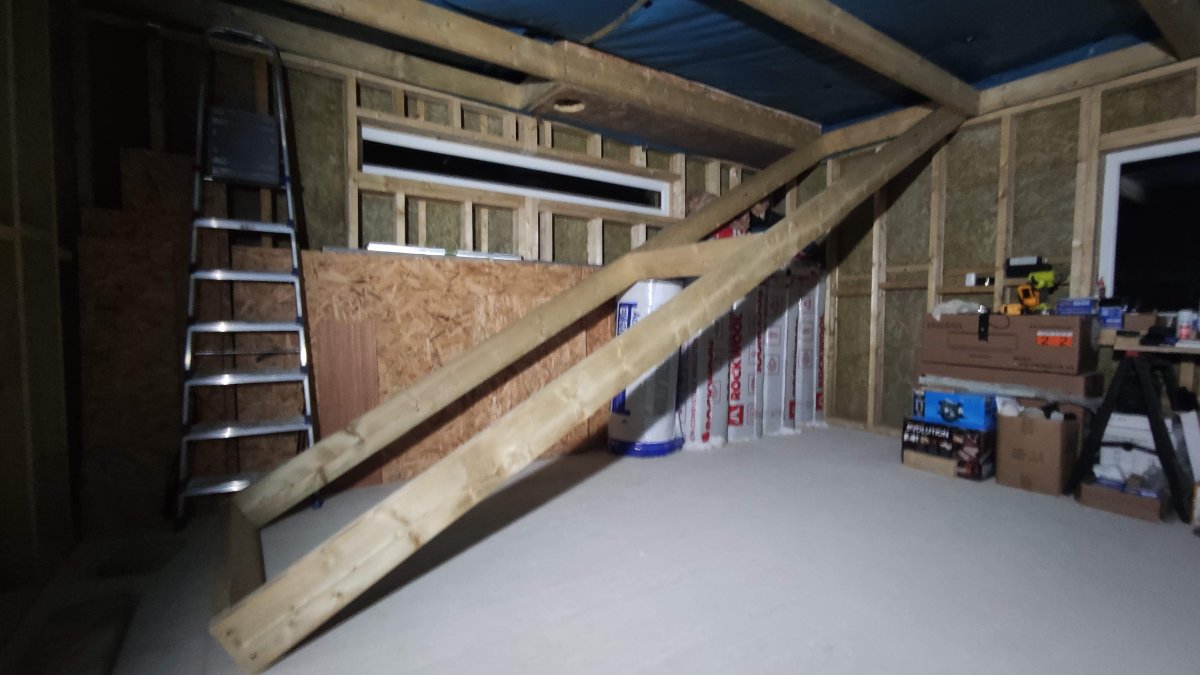 So, As I have said, all ceiling frame sections were assembled in position and slid across to be connected on top of the inner leaf walls. However, obviously the last one could not be done like that because there would be no space to do so. So I had to make this once frame section slightly shorter so that it could be built on the ground and lifter up into position. Shorter so that it would not hit the inner leaf wall when lifted into position up over the inner leaf wall, here it is just before we lifted it up and in: