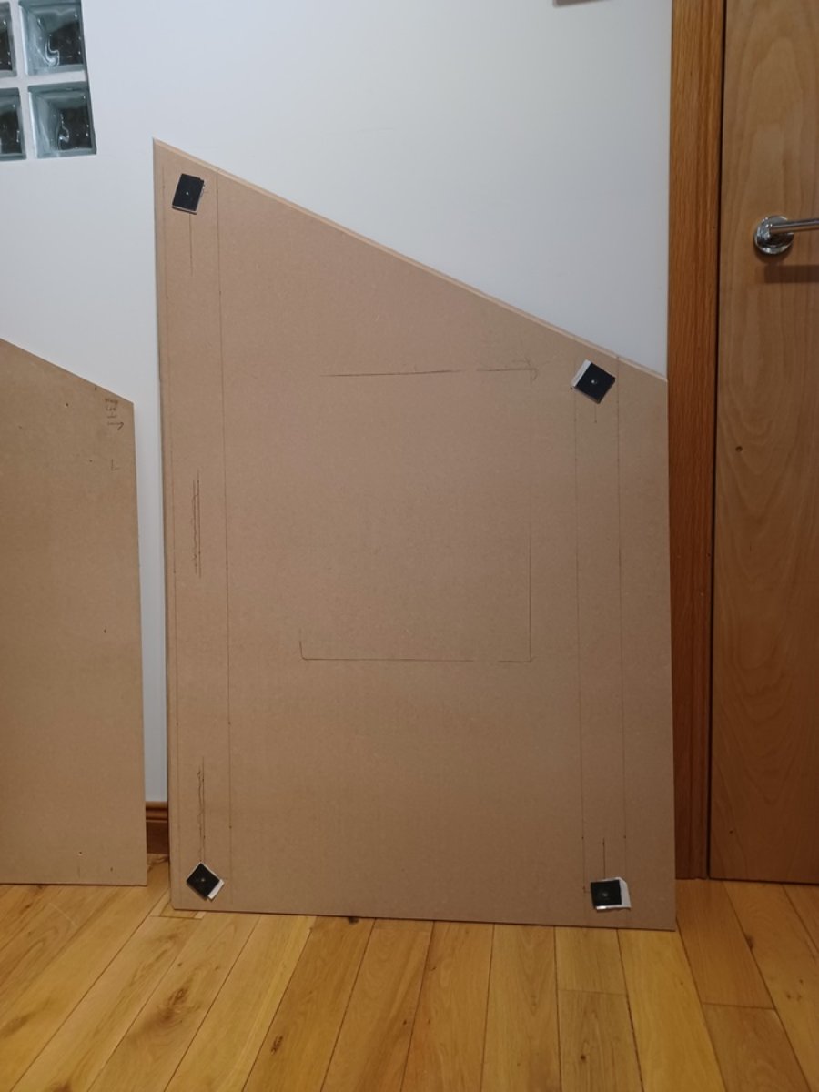 Remove the baffle from the soffit structure. The pencilled rectangle shows where the router template was. The black squares in each corner are pads of 4mm thick MLV, because that's what's going to be added under the whole baffle face.