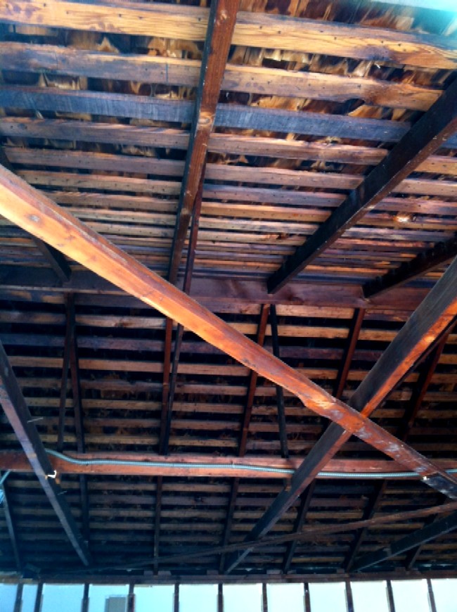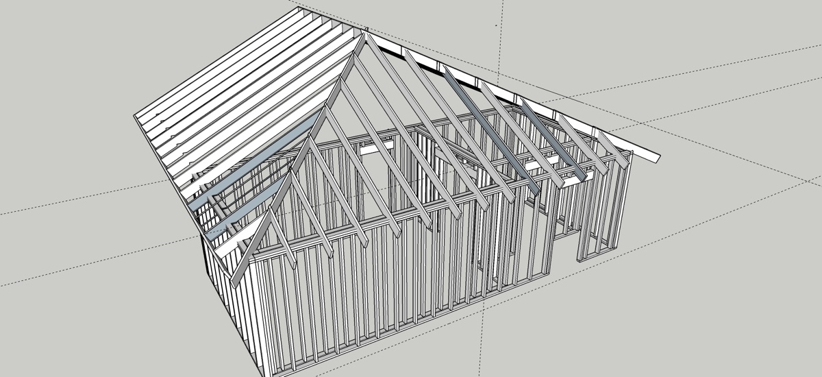 At the rear of the room the ceiling will slope back down (from flat) somewhat due to the hip roof construction. However that slope should only be about 2' at most and that's probably about how deep the bass traps will be at the back, so it shouldn't be a big deal right? See SKP & JPG below for how the main roof of the house sits over the garage: