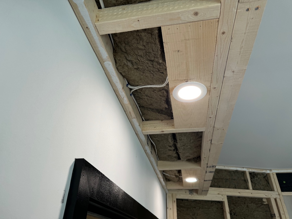 The soffits are all framed up and the electrical is run for the puck lighting. I’m stuffing them now as you can see. It’s just very itchy work and takes quite a bit of time. These are the super chunk style traps in the front, there will be similar in the rear of the room.