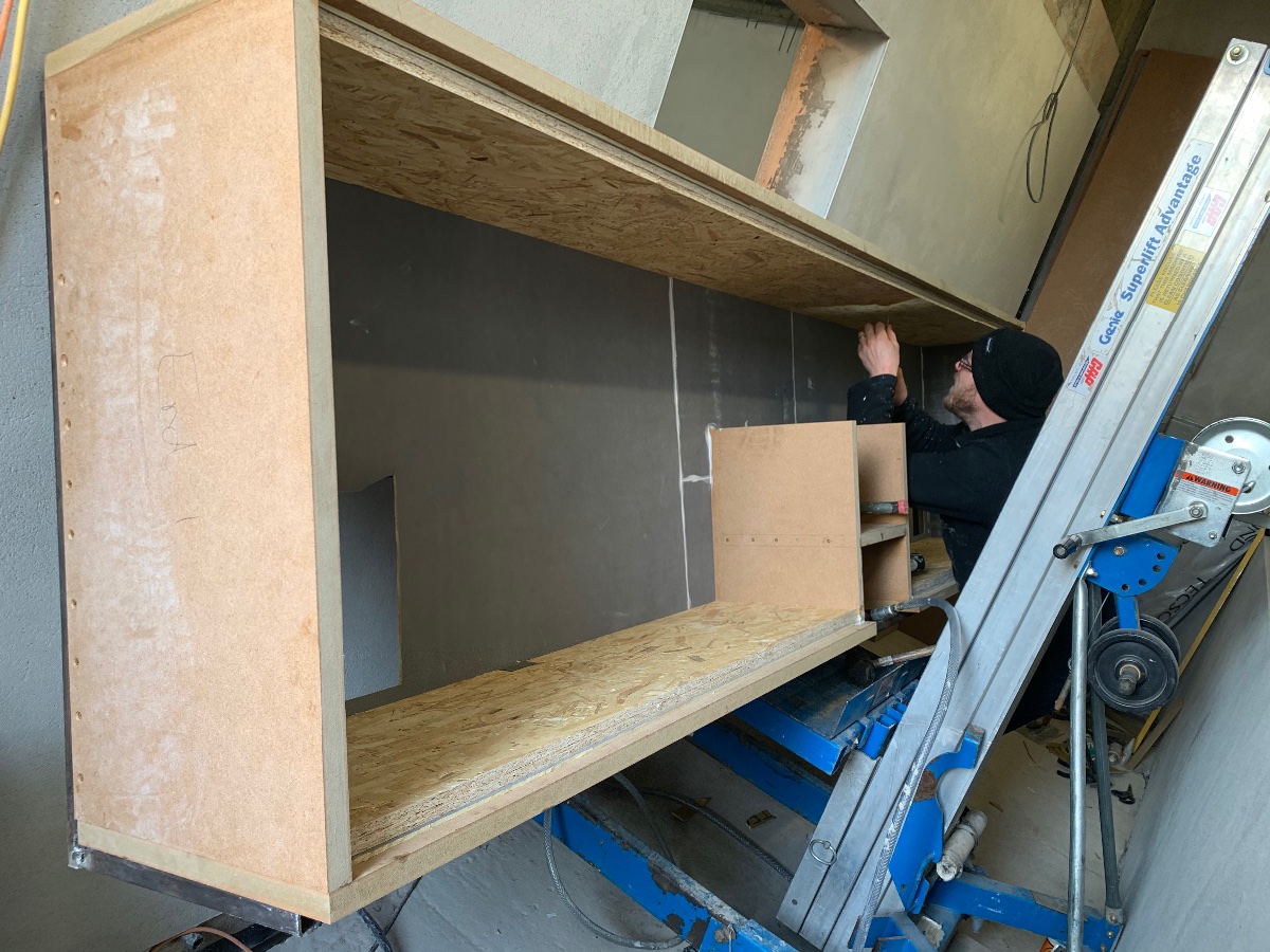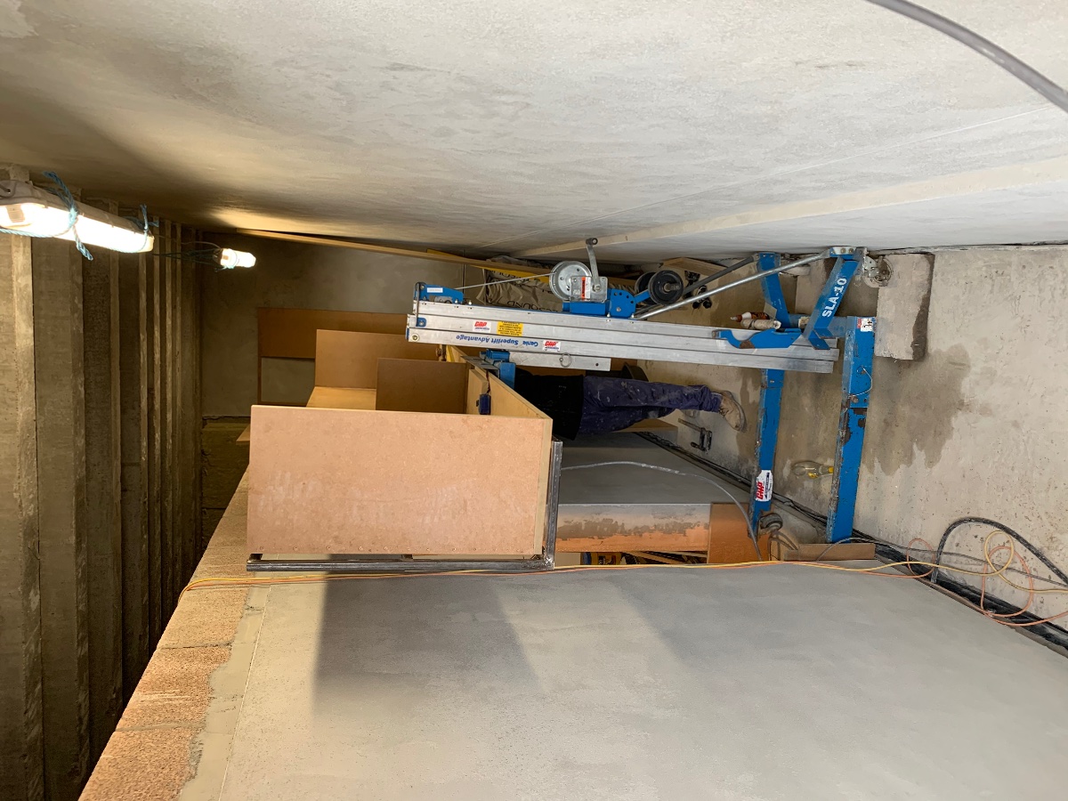 It sits on a Genie lift which will winch up and down. We’re having to build the silencers in the corridor, which has limited width (1.4m).