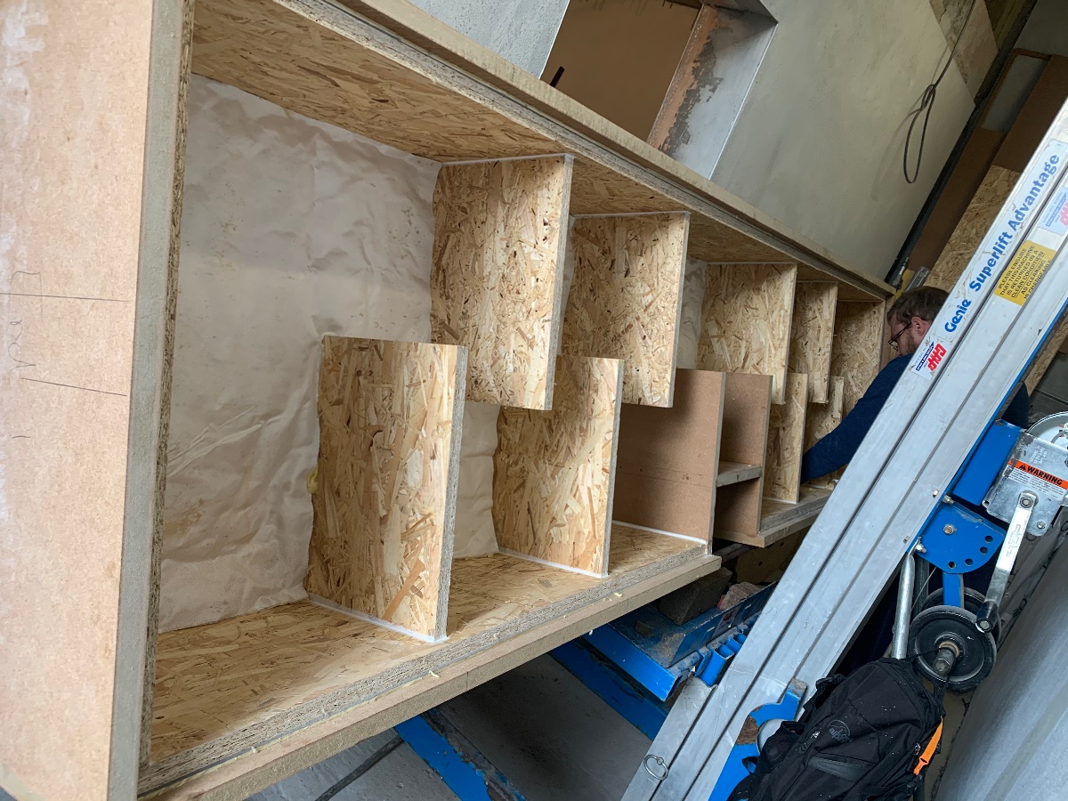 Next was the OSB. As the silencer is longer than the OSB is available, we have two sheets of 11mm so we can stagger the long joints. These were easier to measure and cut accurately. All glued, pinned then screwed but not copiously as Stuart mentioned the function of the MLV will work best if it is not held rigidly.