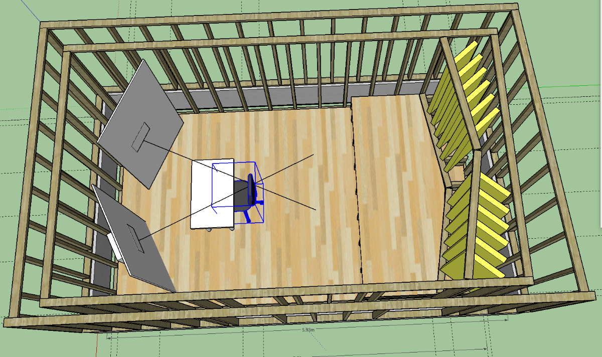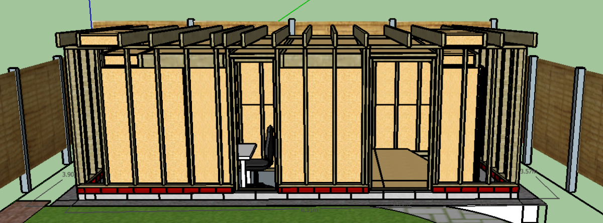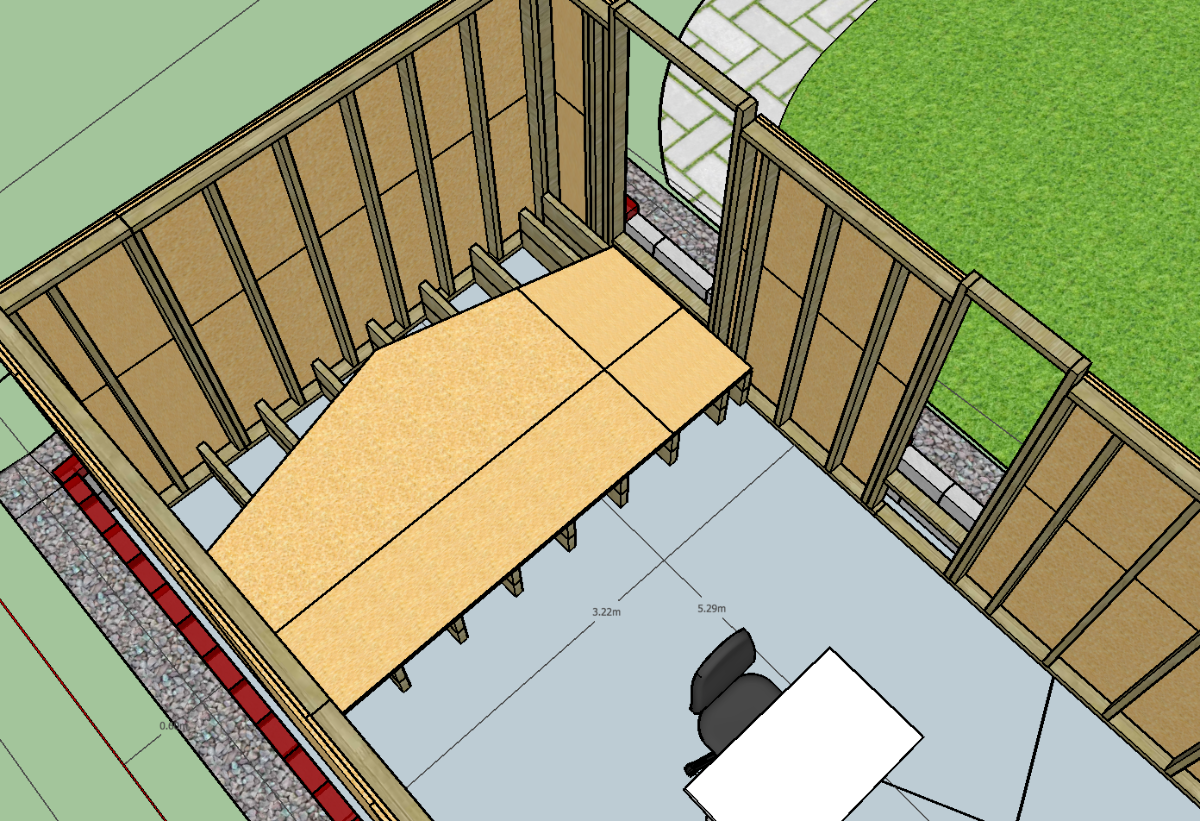 Excellent! So the entire building will be your studio, no space taken up by anything else. That gives you about 17m2 slab footprint, so you'll need to work carefully to make the best possible use of that space.(3.22m wide, 5.29m long, 2.3m high). I have decided not to bother putting a toilet and lobby area in to the building, for several reasons, so the design is now more straightforward.