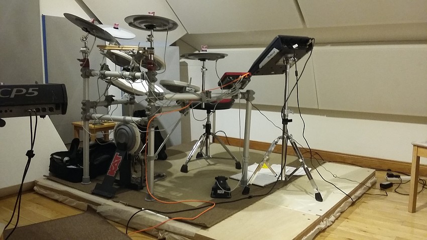 My band was rehearsing here all weekend, and I bolted together a test of the 6x6' configuration. It just has a wood spacer between each riser component, the proper trim has still to be fitted. There were five of us in total for a "silent" rehearsal using headphones as monitors. The electric kit would have fitted entirely on the 6x4' riser, but the extra side bits were useful for the SPD-SX drum pad.
