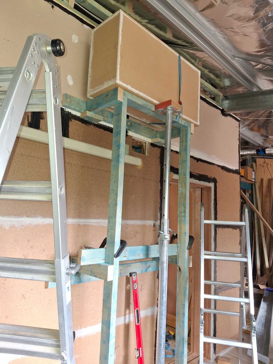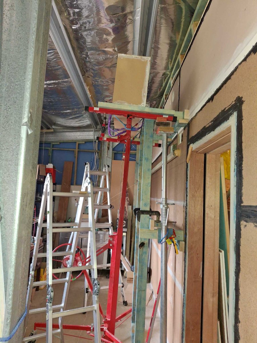 The drywall lift and acrow props got the job done (with a few straps for safety) :D
