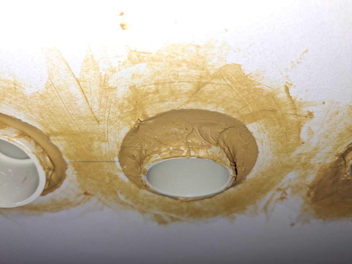 I’ve also been busy sealing penetrations for electrical and network cabling – “Big Stretch” for these. I’ve taken, what I think is a conservative approach by opening out the penetrations a bit (per pic), squeezing as much sealant as I can into the gap between the edge of the hole and the conduit but then I’ve added something akin to a flange around the conduit entry allowing me to apply additional thickness of sealant. The “flanges” are just the cut outs from silencer duct holes.