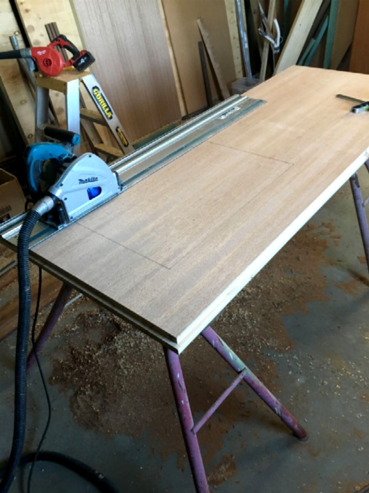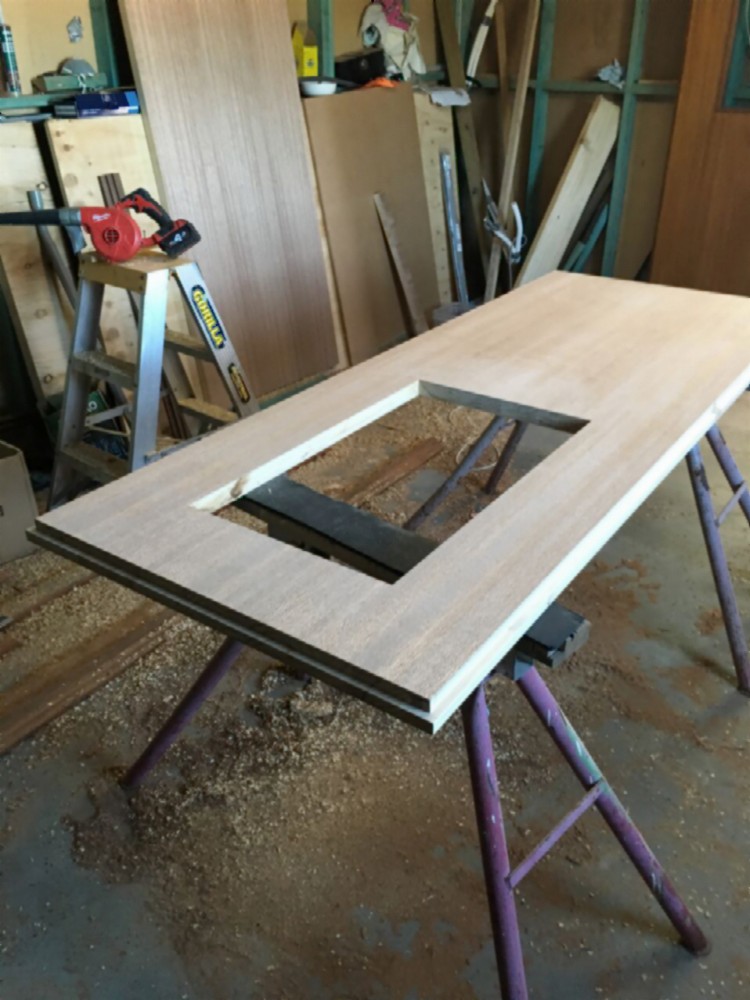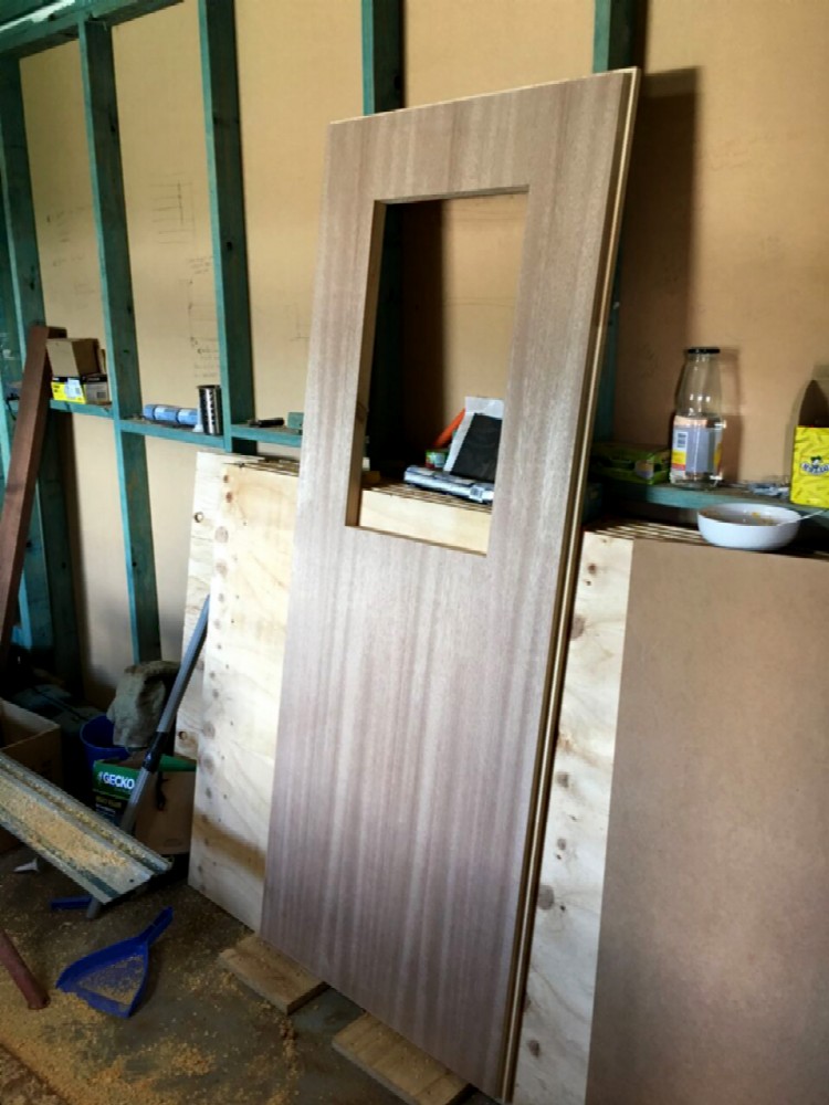 First we started out with an ordinary solid-core door slab (44mm - aprox 1 3/4"). Here's the base blank slab, with the location of the window marked, ready for cutting.