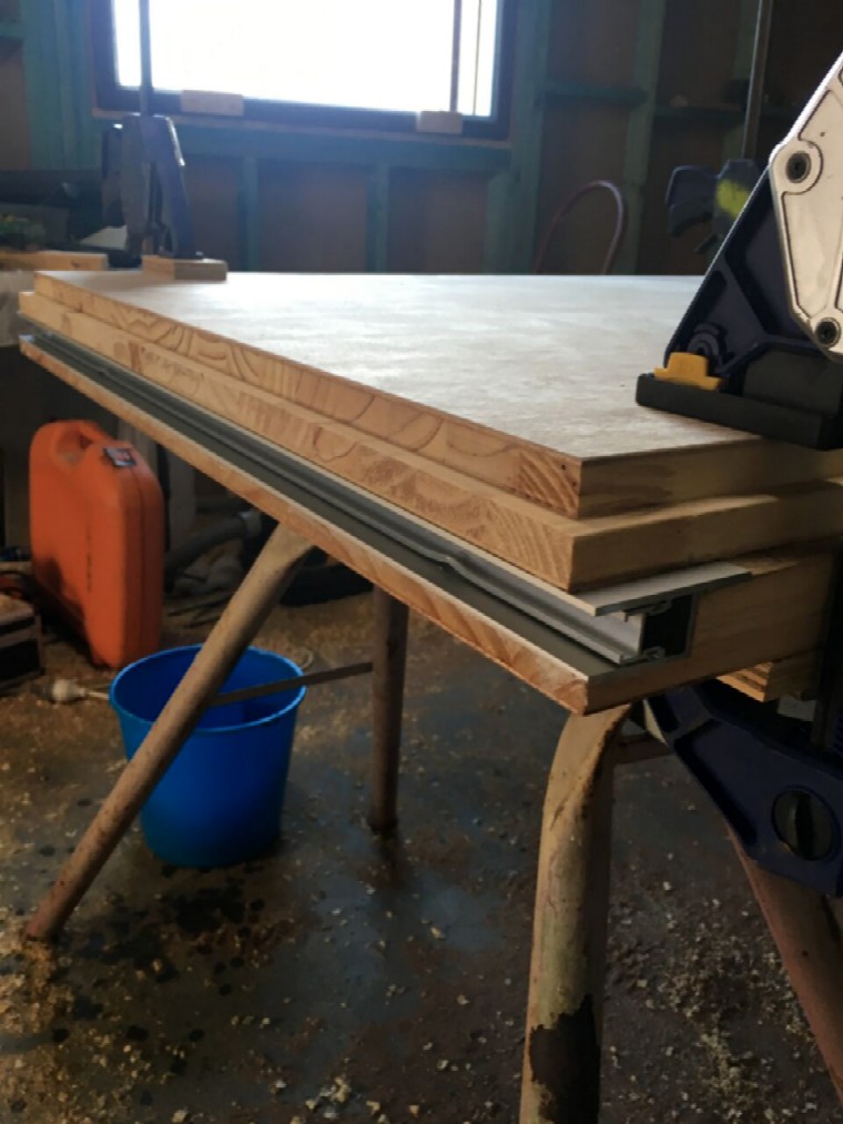 Another view of the layers clamped together while the glue cures.
