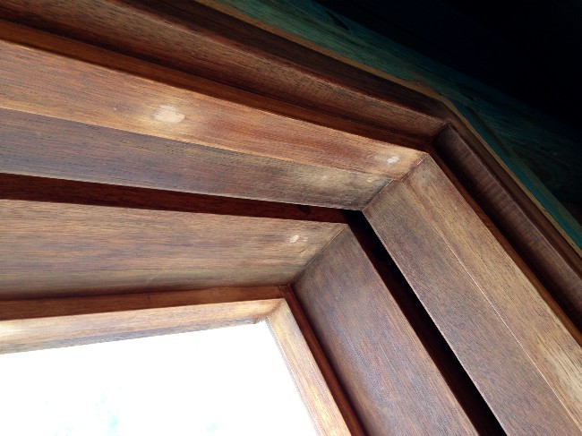 The second set of jambs is now in place here, to create the triple-seals. The nail holes have been plugged and sanded here, and the varnish is about to be retouched: