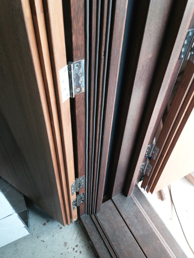 The drop down seal with all three layers of the door in place, glued and screwed together. The base layer is 44mm thick solid wood, and the other two layers are 19mm each, solid wood. Total thickness: 82mm (+/- 3 1/4"). Surface density of complete door: over 62 kg/m2. Each door weighs about 100 kg (220 pounds).