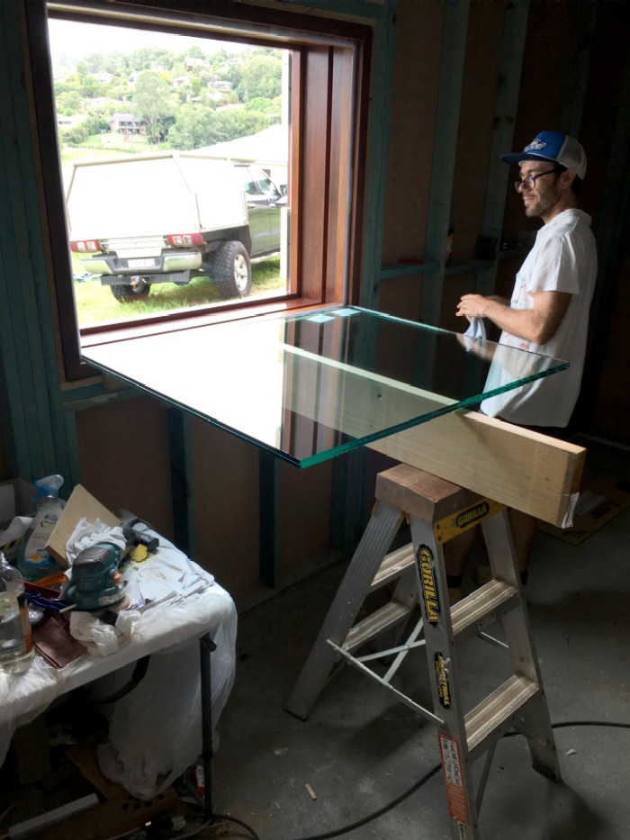 Here the glass has been raised into position, up against the glazing tape, and is being held in place with some more temporary bracing while the front blocking goes in, and the caulking is done.