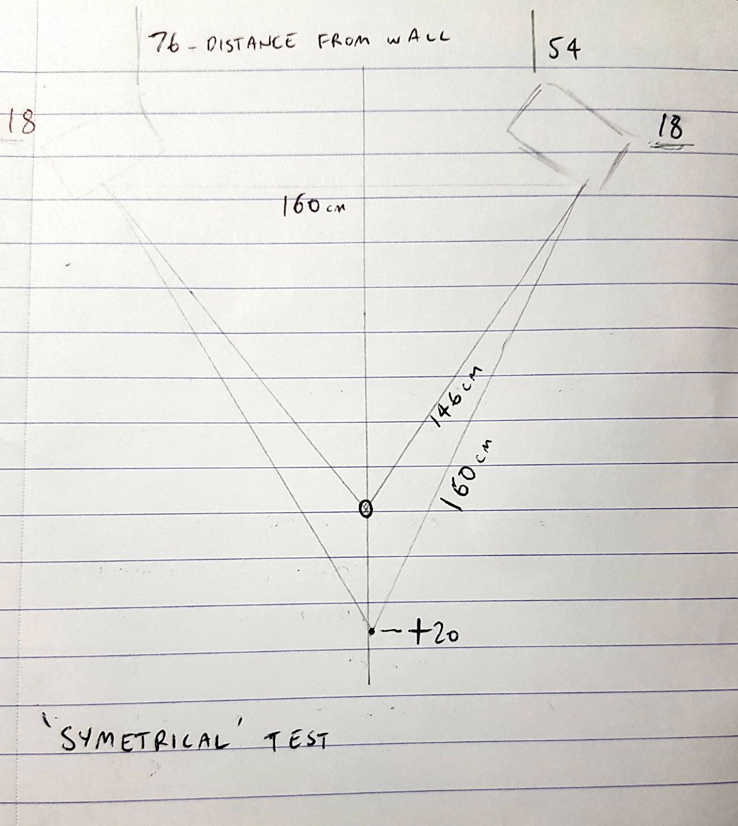 Test 1 "Symmetrical" test is essentially the same listening position as before but with the left speaker brought forward approx 22cm to bring it in line with the 'symmetrical centre' of the room as described by Eric above. 20cms inside the equilateral triangle is where it sounds best to my ears so this is marked as '0' in the walking test. So '+20' is the tip of the equilateral triangle (I've read Stuarts and John Sayers posts about how equilateral triangles are not necessarily the ultimate, I prefer a wider image personally but my room has some obvious width limitations)