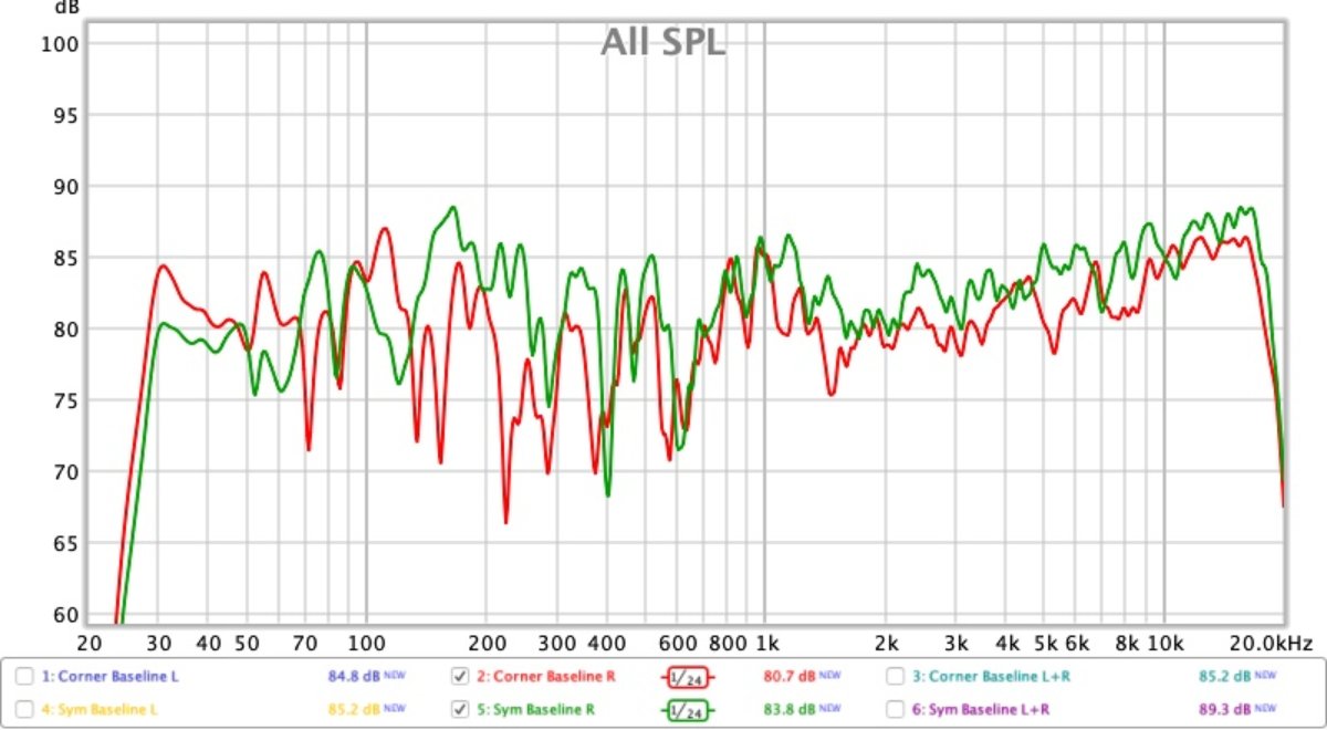 One final test which is interesting is another full L / R / L+R measurement from the exact mic position from the "Symmetrical Baseline" test, but with the speakers moved to the corner position. I thought this might illuminate which issues are SBIR and which issue are modal.