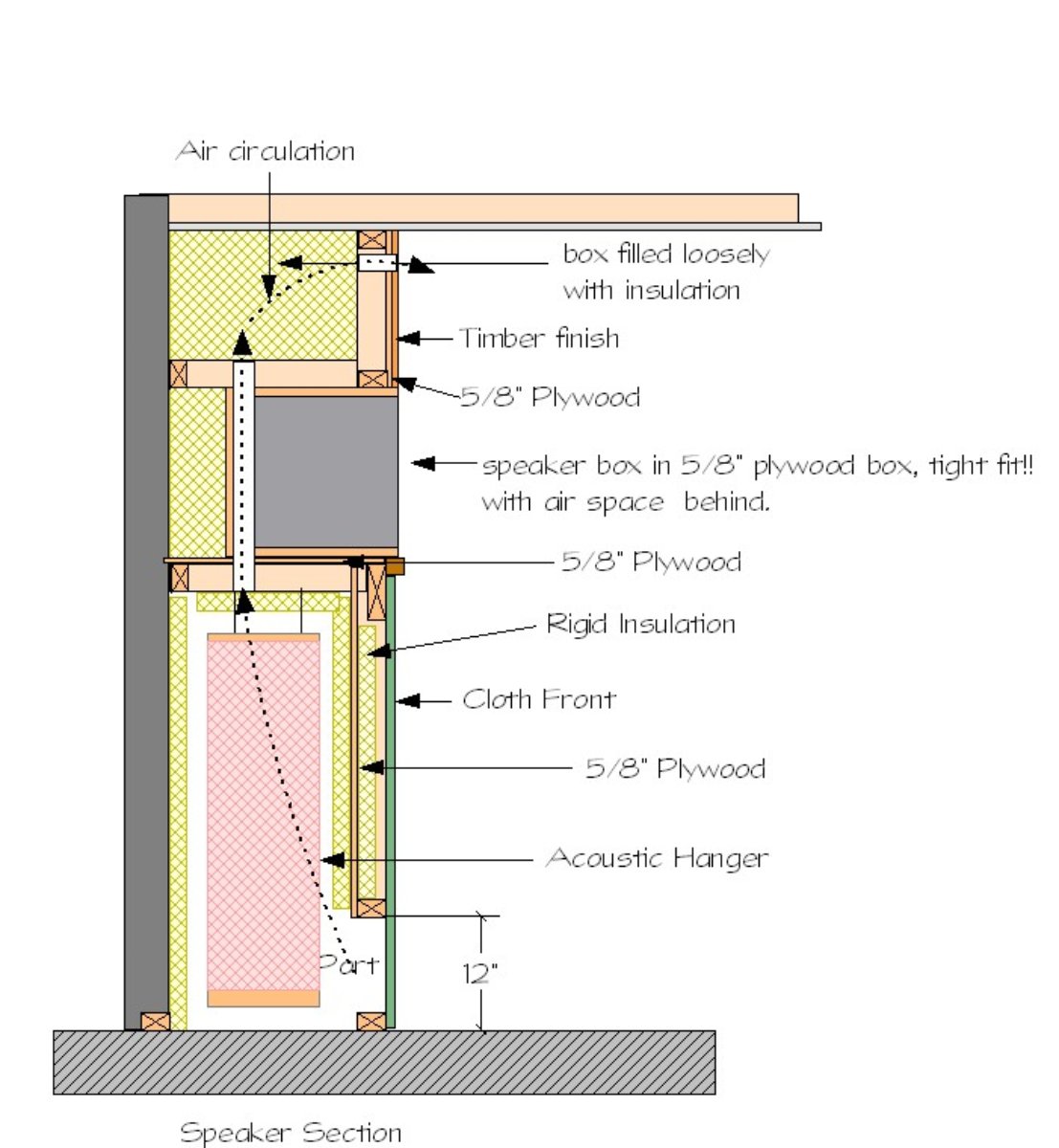 OK, so I have been reading more and more about soffits/flush-mount baffles and the theory around it and I'm a bit confused as to what I should do between my baffles. As they are close together they can either meet or I can leave a gap. I'm concerned that if they meet together then the sound might diffract at the centre angle and shoot straight out at the listening position. On the other hand, if I make a gap then I'm breaking the "infinite baffle" and leaving an edge for diffraction. From what I've seen, having a gap with absorption in it is a method many use with more widely spaced speakers, but will it work with closely spaced speakers like this? The Third option is to have a straight hard bit of wall but I don't know what that would do either so perhaps too unpredictable to consider.