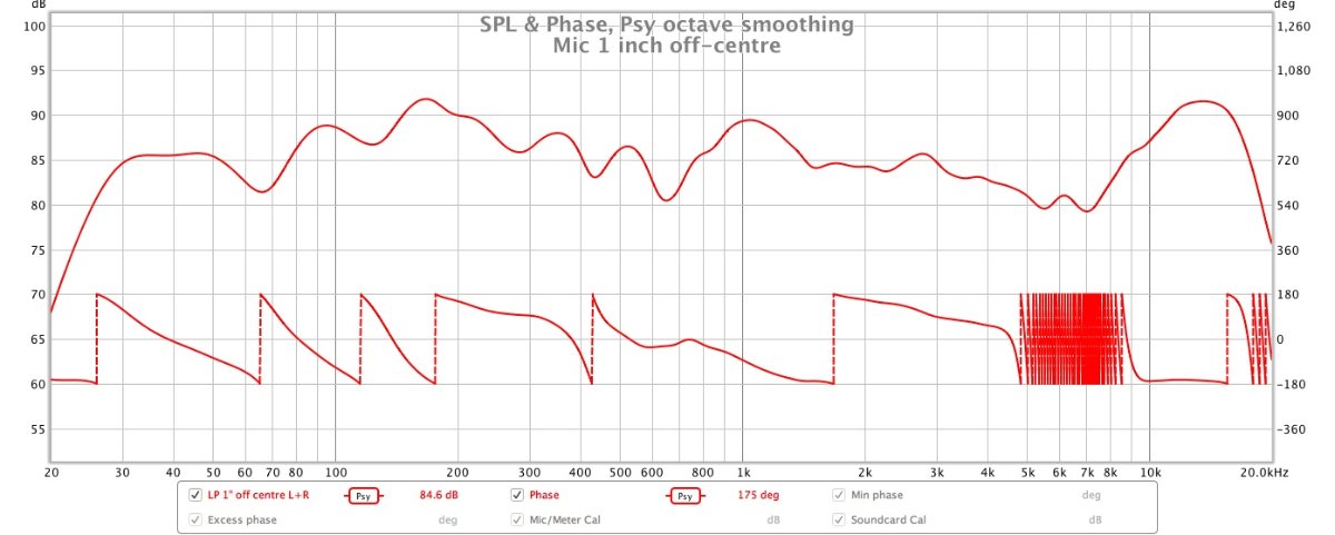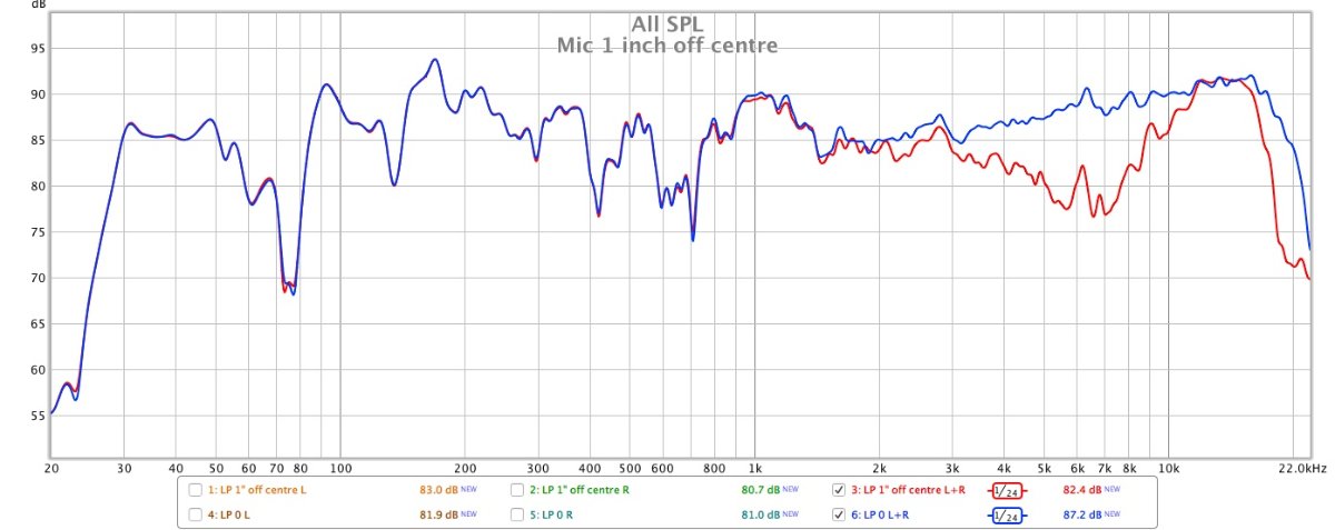 That's a 10+db dip and the only difference between those two measurements is a 1 INCH mic movement.