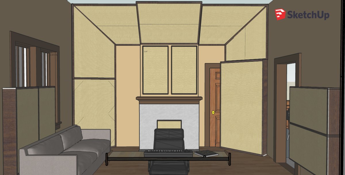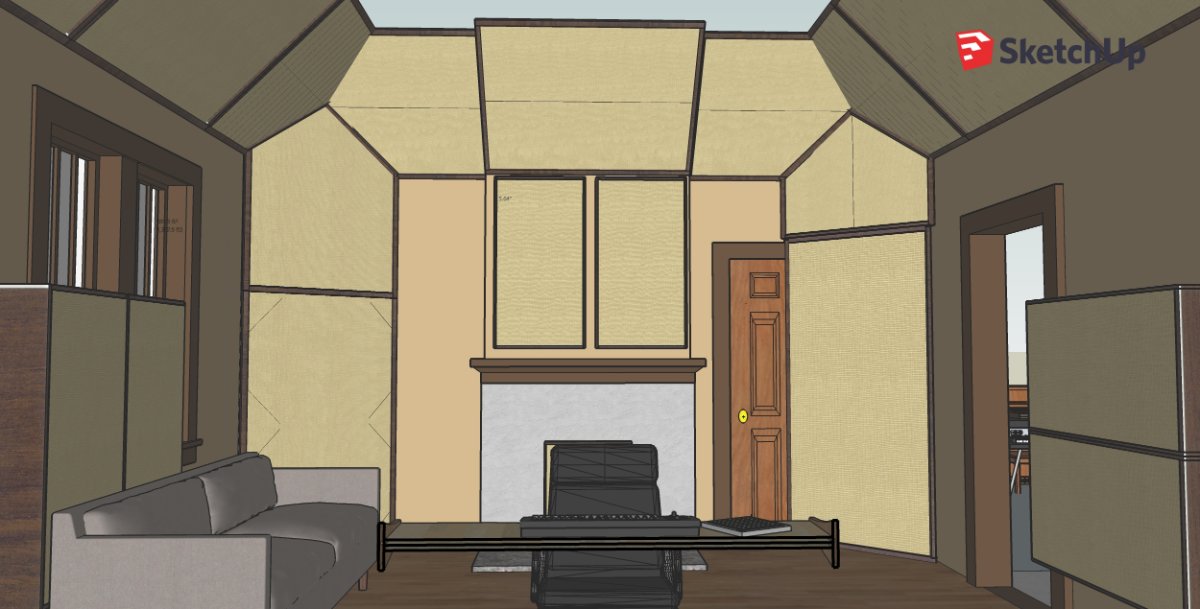 (unless I bring the superchunk down a few more inches to cover the top of the door frame) Also, I made it rectangular since a triangular superchunk will always be in the way of the path there even if you scoot it around (and that doorway will be used often). I figure with more of a rectangular construction, it can at least sit flush to that right wall when I need it to. I'm going to play around with some angles though as I can probably make a hybrid type shape to serve both purposes a bit better. However, it still won't match the insulation depth of the opposite corner superchunk, but it will hopefully match the performance enough to keep things somewhat symmetrical in the lows (though Stuart said it wasn't as necessary on the rear wall).This arrangement seems more doable to me than hangers (not sure what the performance difference would be between the two though...). I just don't know how I would work with those in any kind of symmetry considering the door and the fireplace. I would need a lot of blueprints to understand how to properly frame these into the room when I'm building. That part of this whole process is a mystery to me at this point as I have very little experience. BUT I'm a quick learner and know I could pull it off with the correct understanding/blueprints. Again, maybe I just need to pay Stuart!