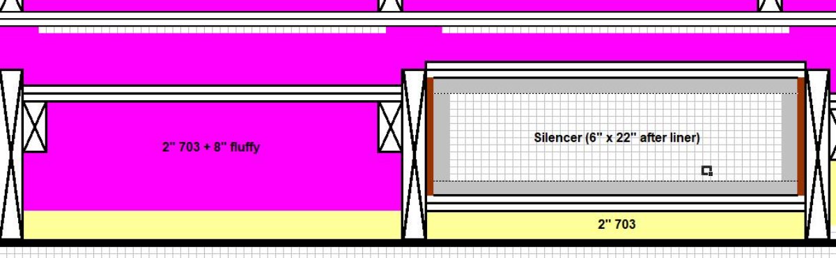 I realize that everything depends on everything else and it's hard to ask a question without going into every aspect of the design. But I'd like to focus on the inner silencers here. Due to a number of space constraints, I'm looking at placing these inside the inner leaf joists. In order to accommodate the inside out ceiling, I plan to use 2x12 joists. This provides a decent amount of room for treatment and maybe just enough space for the silencers, although the height is still limited to about 6" after adding 1" duct liner. Joists are 24" apart.