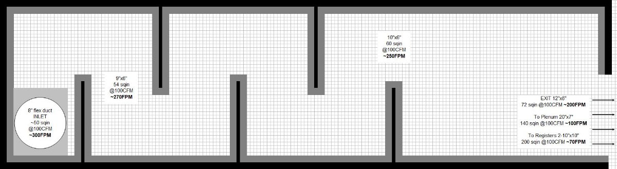 I calculated the interior area would keep 100CFM at close to 100FPM. The 8" duct would again be the bottleneck, but still under 300FPM.