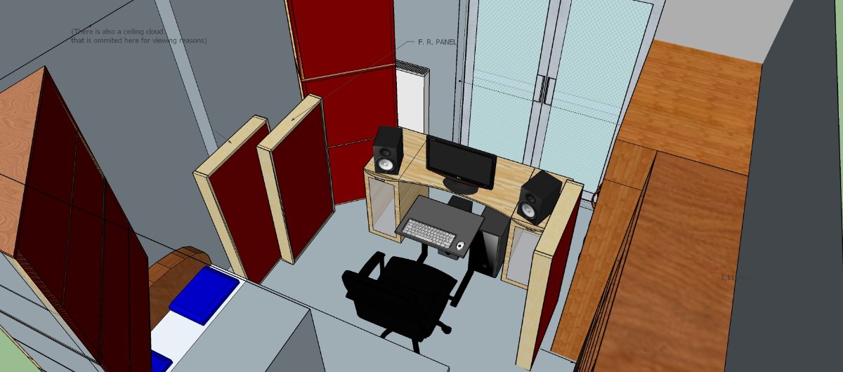 So, I have a bedroom which is currently the only room I can use for mixing. The rough dimensions are 3,26m x 2,5m(due to furniture) x 2.76m. With Stuart's useful advice in the initial topic I was able to build 3 big corner absorbers along with the 3 First Reflection panels I had already, as well as a ceiling cloud that is omitted in the sketchup snapshots for practical viewing reasons. My monitoring setup consists of a pair of hs5's paired with an adam sub7 , a pair of APS klasiks2020 as mains and a 2.1 desktop system. In my current setup my mains don't perform as they are meant to and fixing this will practically be the goal of this very topic.