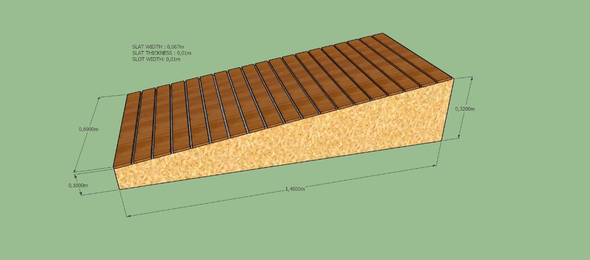 So while trying to find out what would be best for improving the frequency response of the room I ended up leaning towards the helmholtz slat resonator. My aim is to decrease the response graph roughy between 150 - 570 hz so that it is closer to flat. Now, while trying to estimate the construction dimensions and shape I found out that it would be quite hard to cover all that frequency range with a single unit , so I thought of splitting it into two parts. The first part will be roughly 320-570 hz and for this I have already made a sketch which I upload here.
