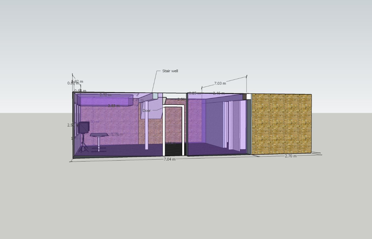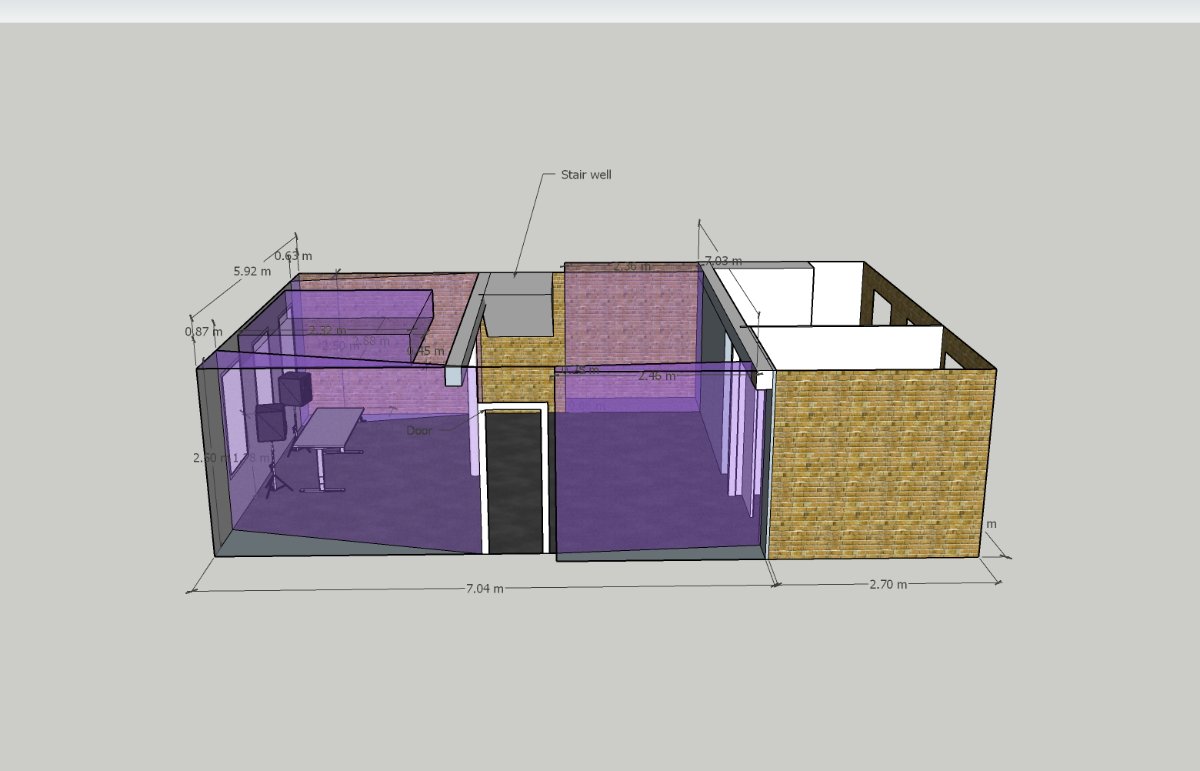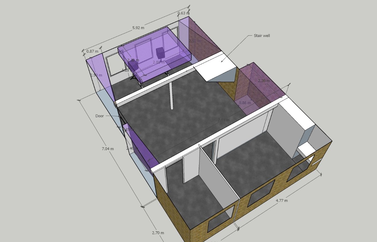 Everything in the Sketchup model is accurate and to scale including the desk/speakers. The windows behind the speakers have different distances to their adjacent side walls (this is not an error in the model). The wedge shaped structure to the right hand side is a stairwell. The rear rooms are used for storage and the rear wall FRZ is not really treatable at this stage due to a lot junk stored up against it. This internal rear wall is plaster like the ceiling, all other FRZ's are bare brick. Floor is carpet on a cement slab & ceiling is 8ft 3inch. The room is ot very symetrical hence the inconsistent approach to treatment in the 4 corners. The room is quite dead sounding as is due to all the stuff in there combined with the carpet floor.